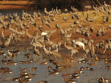 There were several other species of birds on the refuge. Greater white-fronted geese, a snow goose from the Arctic Circle, Gadwall, ring necked ducks, canvas back ducks, shovelers and many other species. We even met a Barred Owl up close and personal along the walkway to the observation building. Saturday was a full day of walking, watching and learning from folks in the Welcome Center which had many displays, videos and folks from the International Crane Foundation. In the afternoon we attended a Raptor show that sported an Albino Barred Owl, Snow Owl, Screech Owl, Harris Hawk, Bald Eagle, and a very sociable turkey vulture that flew over our heads many times in the theater. He even walked up and down the aisles while small children squealed with excitement.