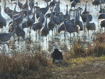 As we walked along the trails at the refuge with cypress swamps and open fields, we were in awe as the cranes soared overhead. Thousands were very close to us as we watched at a wonderful observation building with huge glass windows and speakers so we could hear their shrill prehistoric sound. There were also several blinds set up for watching as well as a wonderful outdoor observation building where we witnessed a Bald Eagle swoop in and catch a fish while a Sandhill Crane tried to steal it from him. He was so upset that he just stood there in the middle of all the cranes and tried to show his prowess.