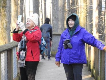 Bright-eyed and bushy-tailed, the group met for an early bird walk at Wakulla Springs, as predicted, it was overcast with some mist but pleasant to walk around in. After marveling at the old lodge and just experiencing the majestic surroundings, we began to walk the trails. Wakulla Springs is home to one of the world’s largest and deepest freshwater springs, with over 6,000 acres of protected natural environment. The springs are home to a wide variety of birds, alligators and other mammals and the winter refuge for manatees, the waters are a constant 70 degrees year-round.